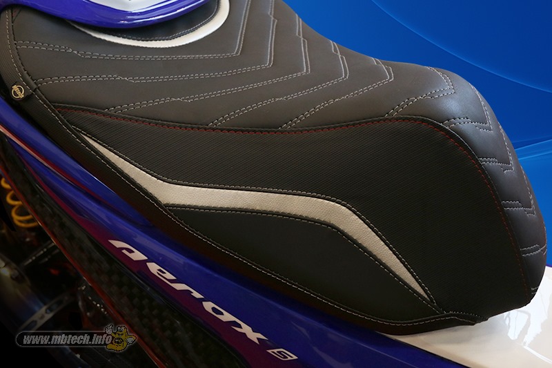 Makin gaya bagian dudukan riders dibuat berpola tanda panah dari benang jahit berwarna silver. Tidak mau kalah keren, sisi samping jok depan diselipkan desain grafis seperti petir berwarna Off White (MB 9006) kepunyaan MBtech Camaro. Masih bernuansa putih, area sandaran bokong rider juga diberikan aksen lingkaran dengan warna Off White .