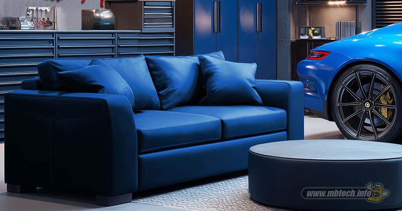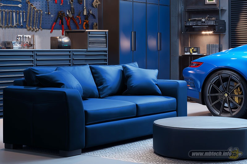 Pertama inspirasi sofa 2-seater berdesain modern minimalis yang dilengkapi bantal empuk. Sofa tersebut dilapis full bahan MBtech Giorgio berwarna Sapphire (MB 6033). Nuansa biru di sofa makin ‘menyala’ akibat disandingkan nuansa serupa pada rak perkakas maupun warna bodi mobil kesayangan.