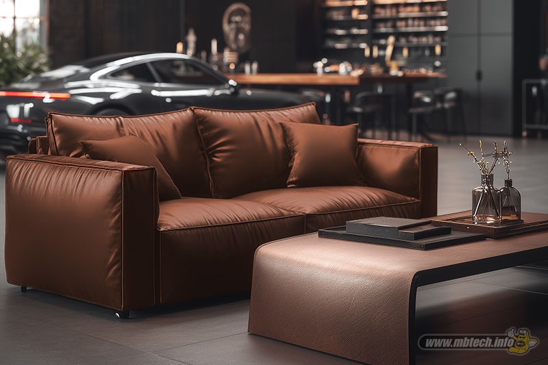 Terakhir keberadaan sofa minimalis elegan yang punya aura mewah mengisi garasi modern ala lounge. Desain sofa dengan motif kerutan adalah pilihan yang tepat, ditambah Mister MB mewarnai dengan Cinnamon (MB 6019) bikin sofa makin terlihat sempurna.