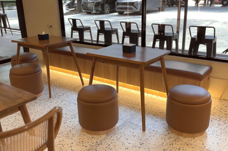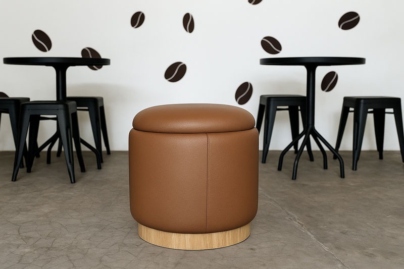 Terlihat di sisi kaca jendela tertanam sebuah bench model deret yang memakai bantalan busa berlapis MBtech Camaro. Untuk warna pelapis cushion bench dipilih warna Saddle (MB 9012). Kemudian warna Saddle juga dipakai di pouf model tong berkaki kayu.