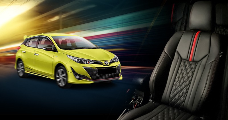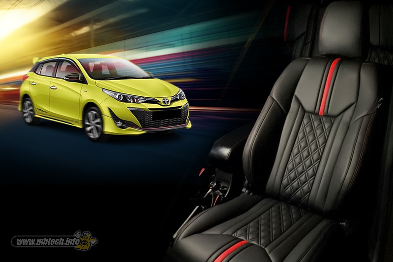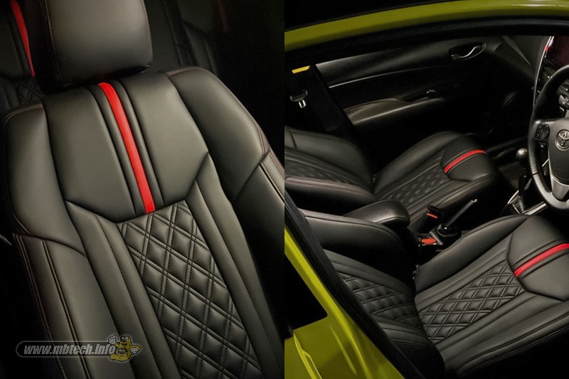 Interior hatchback Toyota kepunyaan konsumen seatmaker MGS Djok Kendari dimodifikasi dengan konsep elegan dicampur aksen sporty memakai bahan MBtech Premium-Carrera.
