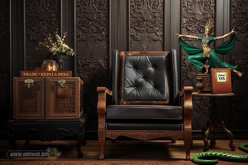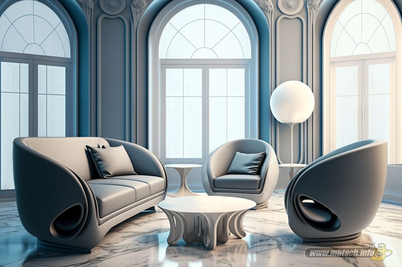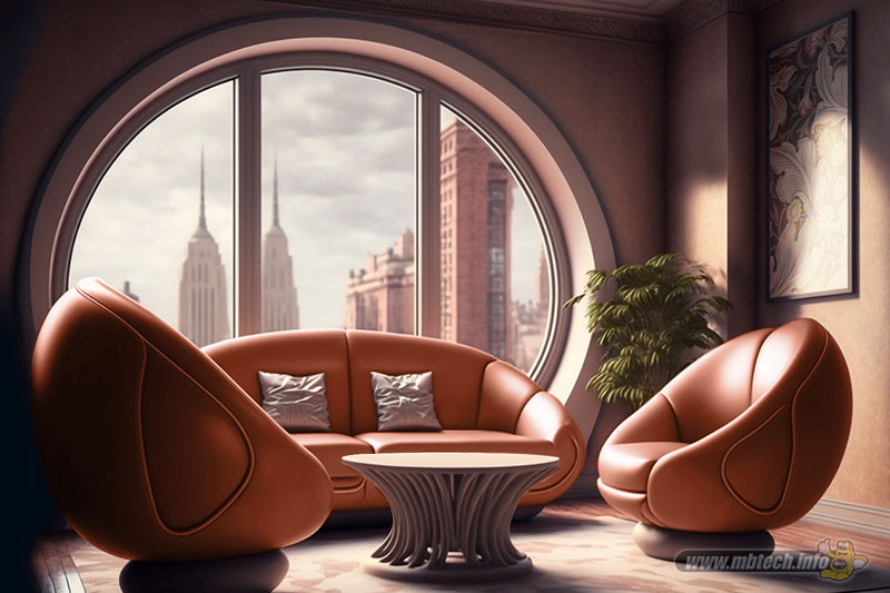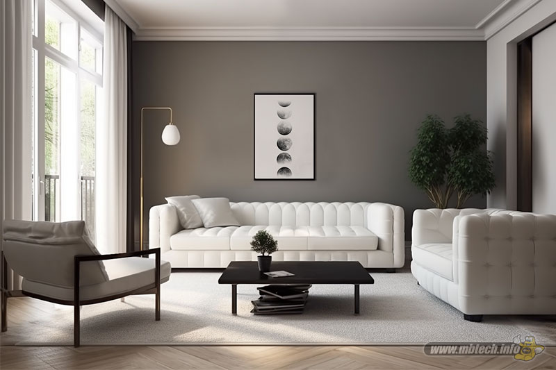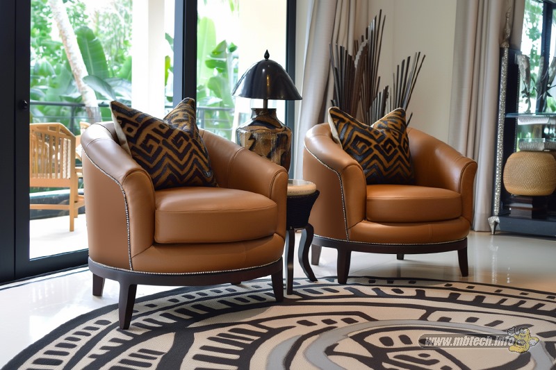 detail sandaran melingkar dan aksen motif hitam glossy, menambah kesan mewah interior ruang tamu.