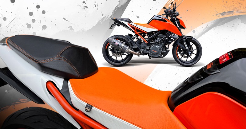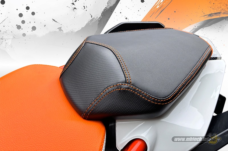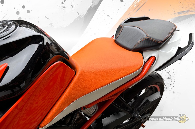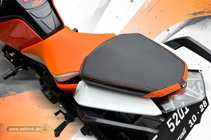 Seatmaker KSR Jok Motor mendesain jok dengan warna senada livery KTM Duke 250 milik Cici, yaitu perpaduan bahan MBtech Camaro Fiesta warna Orange (MB 7003) di dudukan jok rider dan aksen White (MBRC 2302) bercorak karbon dari MBtech Riders-Cruiser di sisi sampingnya.