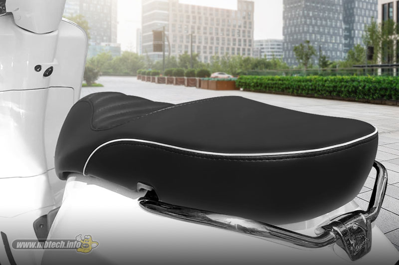 Nah salah satu hasil jok terbarunya adalah model double seat untuk Vespa Sprint. Jok dengan balutan warna Black (MBPC 1001) dari MBtech Premium – Carrera tersebut dibuatkan garis-garis horizontal di bagian jok pengendaranya. Abe juga menambahkan piping berwarna putih menyesuaikan dengan warna bodi motor.