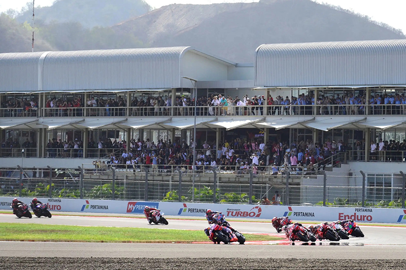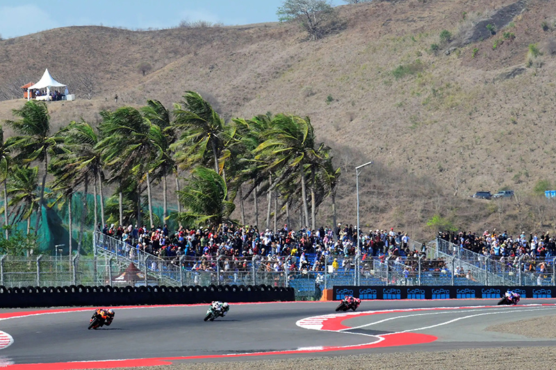 MotoGP yang dihelat di sirkuit Mandalika ini menawarkan pemandangan yang sangat indah dari area trek balap, yaitu latar pantai dan laut biru plus hamparan perbukitan hijau yang menawan.