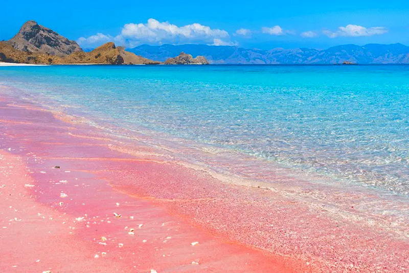 Keunikan pink beach timbul dari hamparan pasir pantai yang berwarna merah muda. Warna unik ini terbentuk dari campuran pasir putih dengan pecahan mikroskopis foraminifera, sejenis organisme laut dengan cangkang merah. Kombinasi tersebut menciptakan gradasi warna indah yang jarang ditemui di pantai lain di dunia. Bangga karena hanya ada tujuh pantai serupa yang tercatat secara resmi.