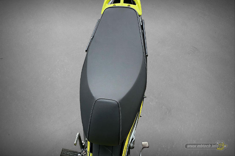Motor berkelir hitam – kuning ini meremajakan jok dengan tampilan full Black (MBPC 1001) menggunakan bahan MBtech Premium – Carrera yang dijahit benang warna silver. Walau tidak ada motif dan bentuk jok yang masih standar, penyegaran tampilan jok ini bisa membuat tampilan motor kembali menawan. Yang penting adalah memberikan kenyamanan saat berkendara.