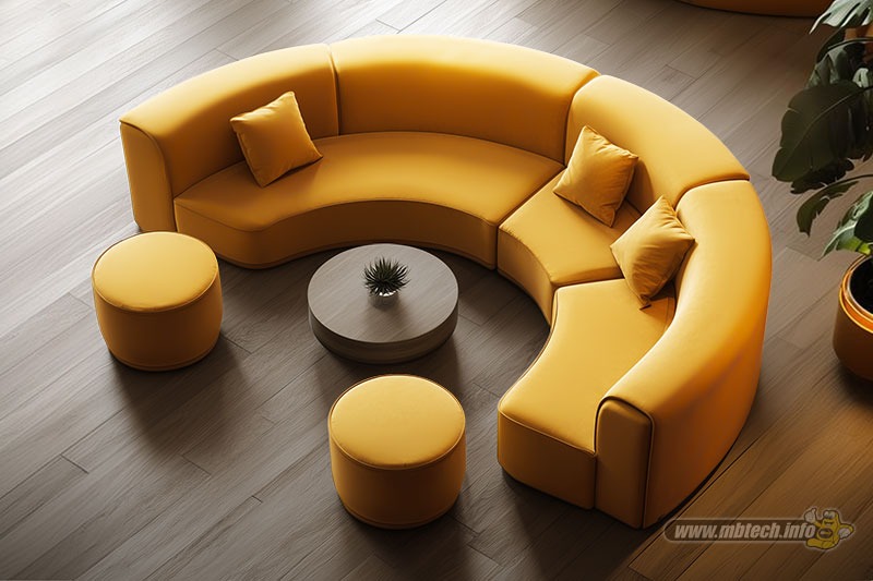 Masih mengacu kepada desain ‘Smiling Sofa’ di atas, dalam ide inspirasi kedua Mister MB cukup mengganti warna yang awalnya two tone nuansanya menjadi single tone memakai warna Mango (MB 7004). Warna buah mangga ini hadir di sofa dan stool.