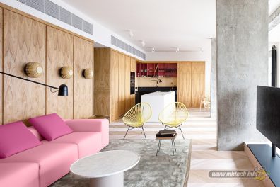 Jika warna putih dan tren warna minimalis seperti abu-abu dirasa terlalu mainstream dan monoton, tak ada salahnya jika kesan hangat material kayu dijadikan dekor pada dinding dan digunakan sebagai motif lantai, berpadu dengan tekstur natural beton unfinished pada tiang penyangga. Sementara warna abu diaplikasikan pada karpetnya.