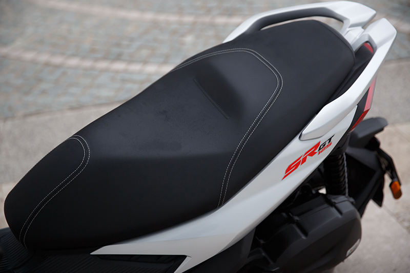 Sedangkan untuk Aprilia SR GT versi sport berlivery sportbikenya menggunakan jok dengan dual tone dilengkapi aksen jahitan benang warna merah.