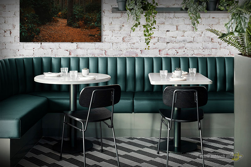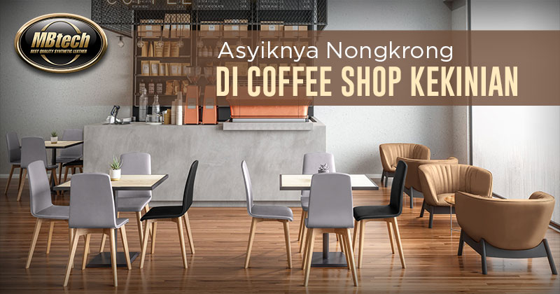 Selanjutnya ada coffee shop dengan tampilan kekinian dan minimalis. Dalam konsep ruangan ini, Anda bisa memadukan beberapa warna pada furnitur yang tersedia. Seperti perpaduan warna Fossil (MB 6004) dengan Black (MB 6001) pada kursi, dan warna Caramel (MB 6022) pada sofa single.