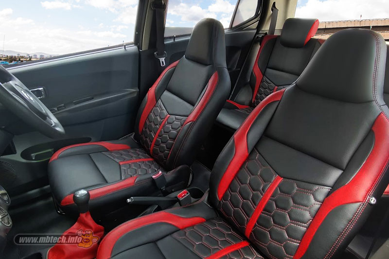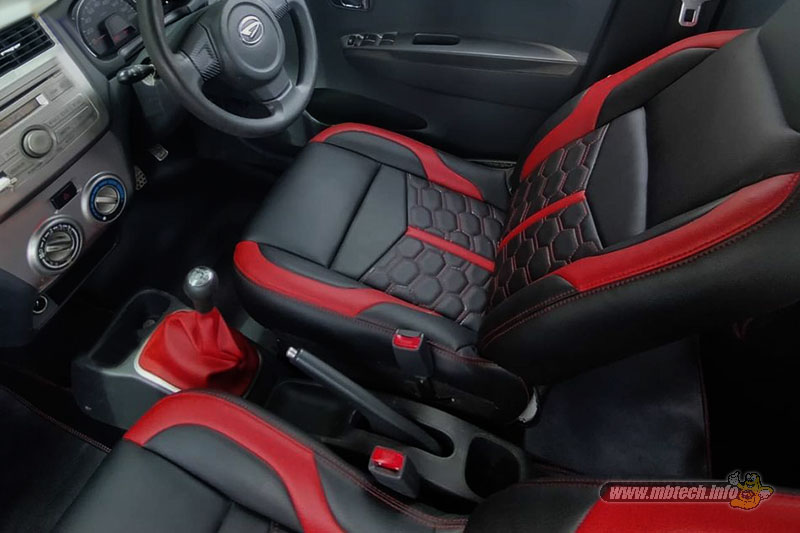 Karena interior Ayla generasi pertama hanya jok yang bisa dilapis kulit sintetis, maka Shandy selain membuat desain baru model paten dari bahan MBtech Camaro untuk jok, ia juga mengganti sarung tuas transmisinya.