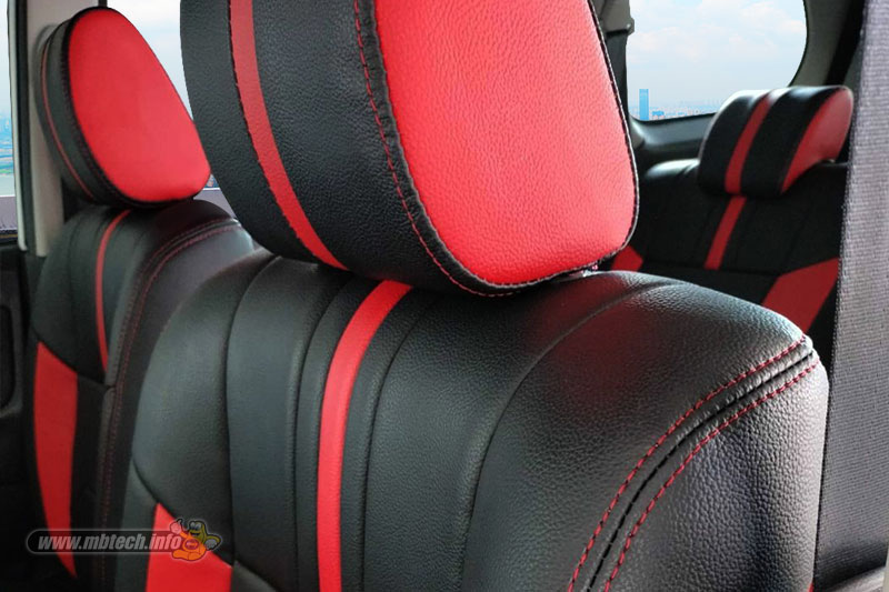 Perpaduan warna Black (MB 9001) dan Elegant Red (MB 9015) dari MBtech Camaro yang membalut jok menjadikannya terlihat sporty. Warna Black menjadi warna dominan pada jok. Lalu untuk waran Elegant Red menjadi aksen pemanis yang membentuk garis vertikal pada headrest, sandaran dan dudukan jok. Bagian sayap jok juga diberikan aksen warna tersebut.