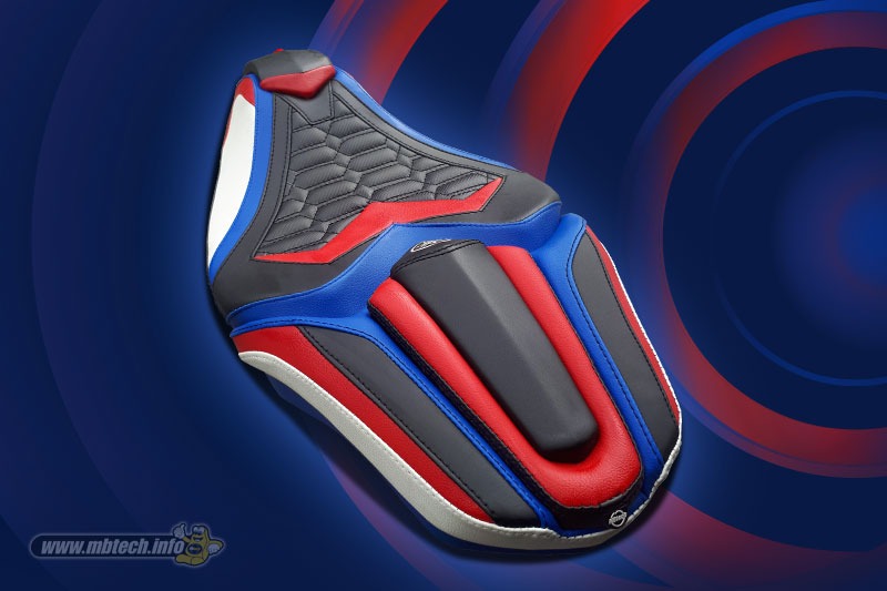 Warna jok disesuaikan dengan menggunakan perpaduan warna Black (MBPC 1001) dari MBtech Premium – Carrera di bagian dudukan dan Black (MBRC 2301) bertekstur karbon dari MBtech Riders Cruiser di bagian tengah yang bermotif hexagon.