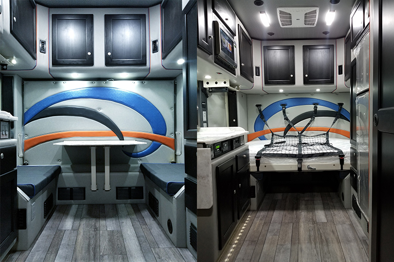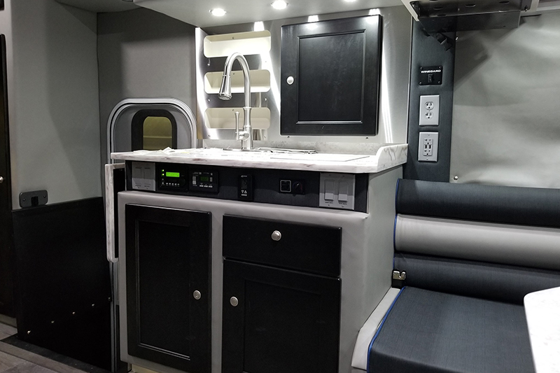Di dalamnya, terdapat sebuah meja yang dapat dilipat dan bisa berubah menjadi tempat tidur ketika bed diturunkan dari dinding kabin. Selain itu terdapat juga serangkaian lemari dapur lengkap dengan kulkas besar, wastafel, kompor dan oven.