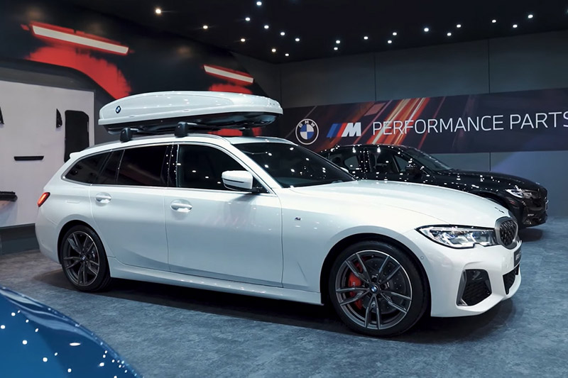 Mobil station wagon ini kini memakai parts M Performance, mulai dari grille, pelek 19 inci V-spoke 792M, M big brake kit dari Brembo, rear spoiler di bagasi, dop pelek floating dan BMW Roof Box with BMW Railing Carrier.