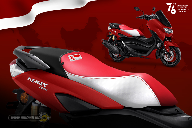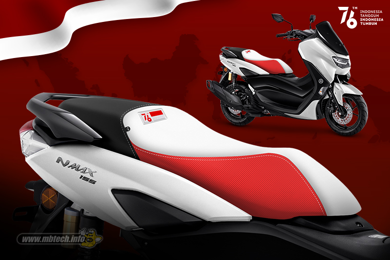 Beralih ke motor Yamaha NMAX, Mister MB mengkombinasikan warna Red pada bagian tengah jok dan di berikan bordir angka ’76’ dan bendera merah putih pada tengah jok. Lalu di bagian dudukan boncenger dilapisi warna Black (MBPC 1001) yang diberikan pembatas single stitch benang berwarna putih. Nah di bagian samping, jok dilapisi warna White bertekstur karbon yang diberikan aksen benang jahit berwarna merah.