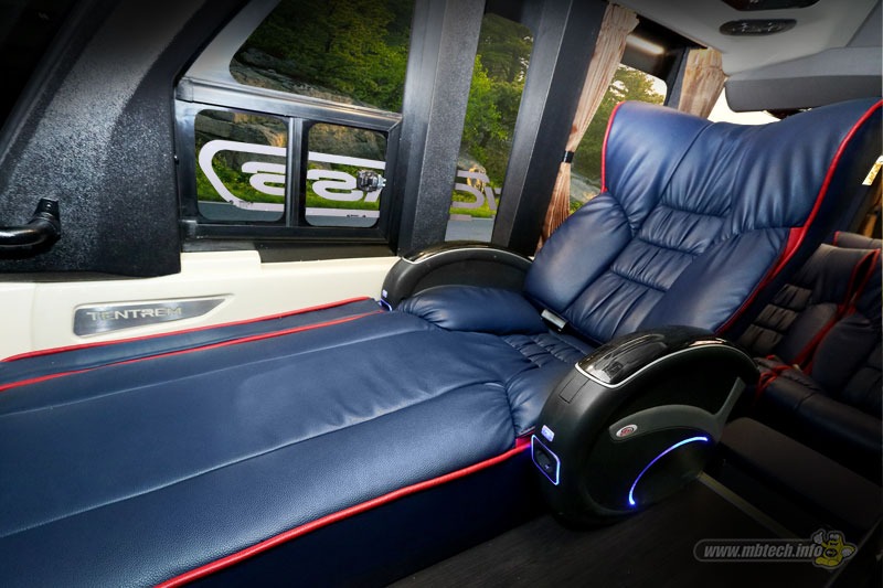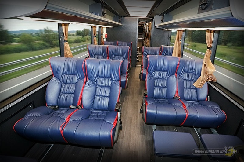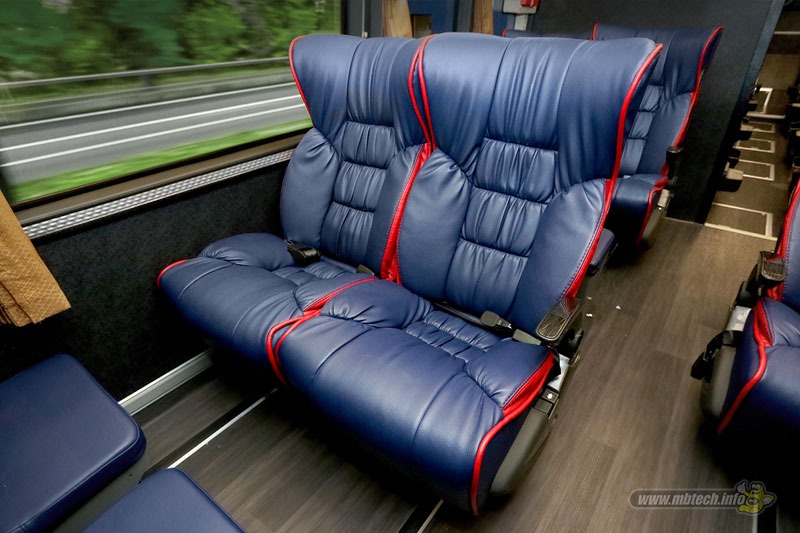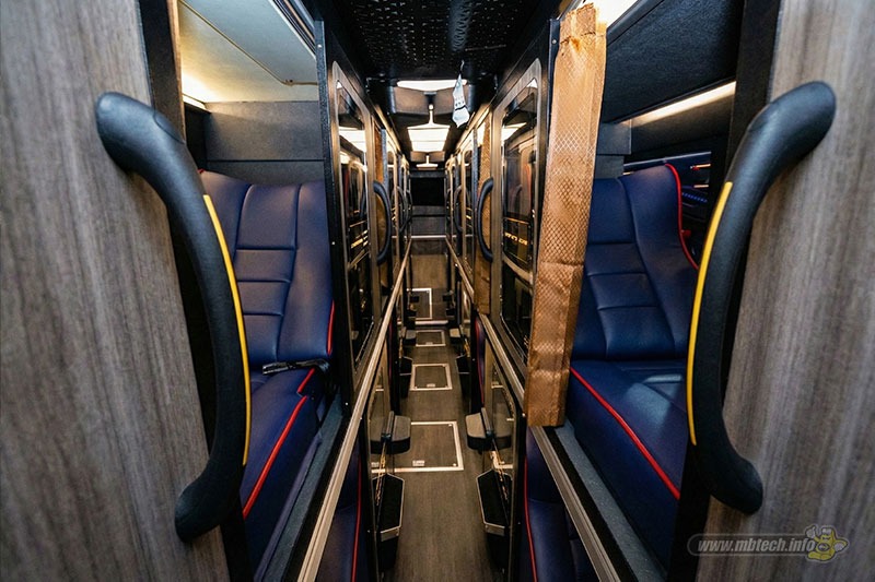 Berbeda dengan kursi sleeper pada Sleeper Cabin didesain menawan dan simpel tanpa detail kerutan. Faktanya semua jok bus ini dilapis bahan MBtech yang teruji penggunaannya di pelapisan interior bus.