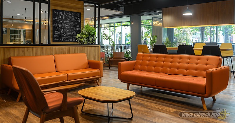 Terakhir adalah inspirasi co-working space berdekorasi industrial. Deretan sofa berdesain modern perpaduan sofa dua seater dan kursi yang digunakan diberikan kenyamanan lebih memakai MBtech. Corak nappa dari MBtech Premium-Carrera bikin mewah tampilan cushion yang dilapis warna Beige (MBPC 1006) dan Brown (MB 1005).