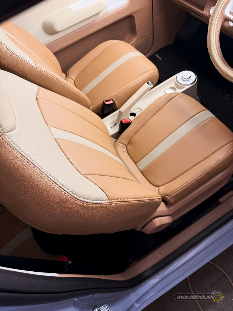 Desain jok dibuat dengan konsep two-tone dan pola jahitan minimalis, menjaga karakter kabin Wuling Air EV yang compact agar tetap terasa rapi dan proporsional. Material MBtech Camaro dipilih bukan hanya karena tampilannya, tetapi juga karena kenyamanan, daya tahan, serta kemudahan perawatannya—sangat ideal untuk penggunaan harian.
