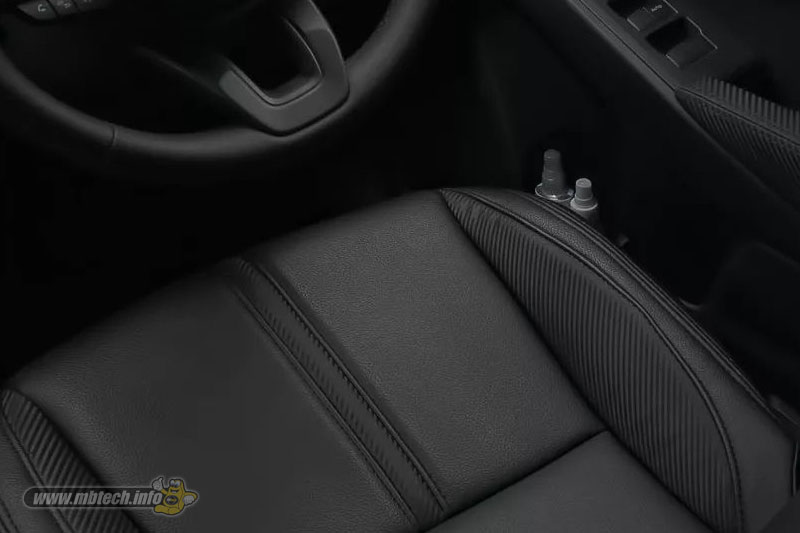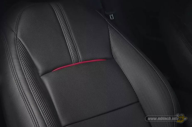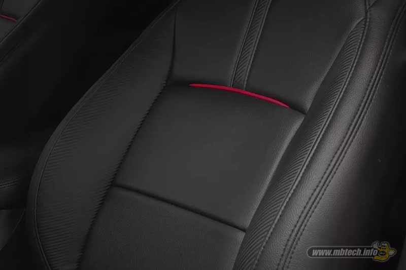 Sekilas desainnya masih mirip dengan motif aslinya, namun di area dudukan dibelah garis ganda bertekstur karbon, dan tidak lupa detail merah atau Hip Hop Red (MB 7001) dari MBtech Camaro Fiesta dibenamkan pada dudukan atas.