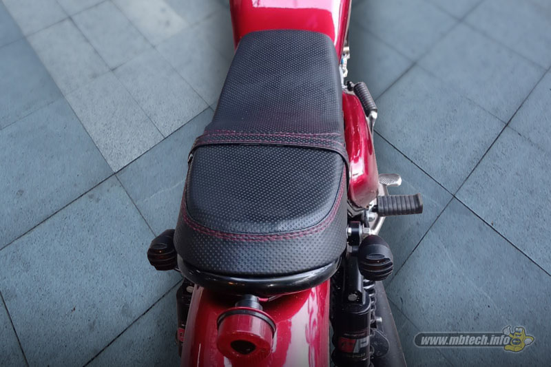 Toyib selaku seatmaker mengganti pelapis joknya dengan bahan MBtech Camaro warna Black Big Dots (MB 9001 BD) yang dijahit benang warna merah. ‘Cocok yang dengan warna motornya…’