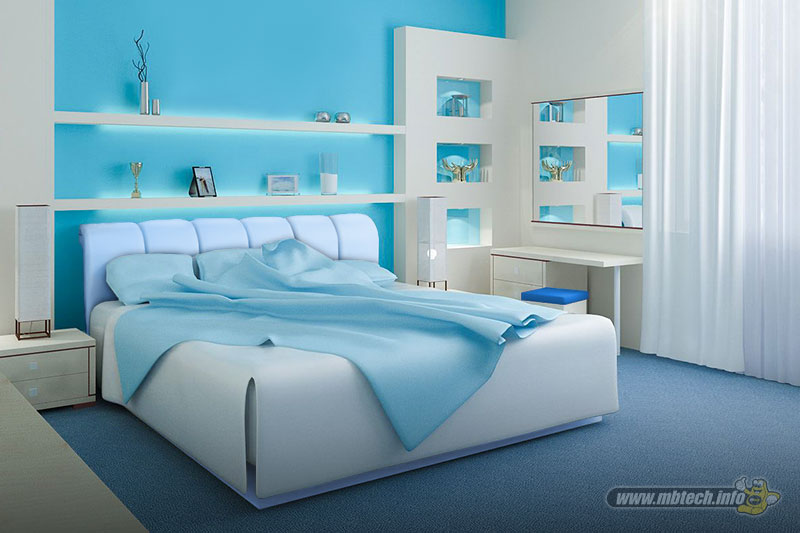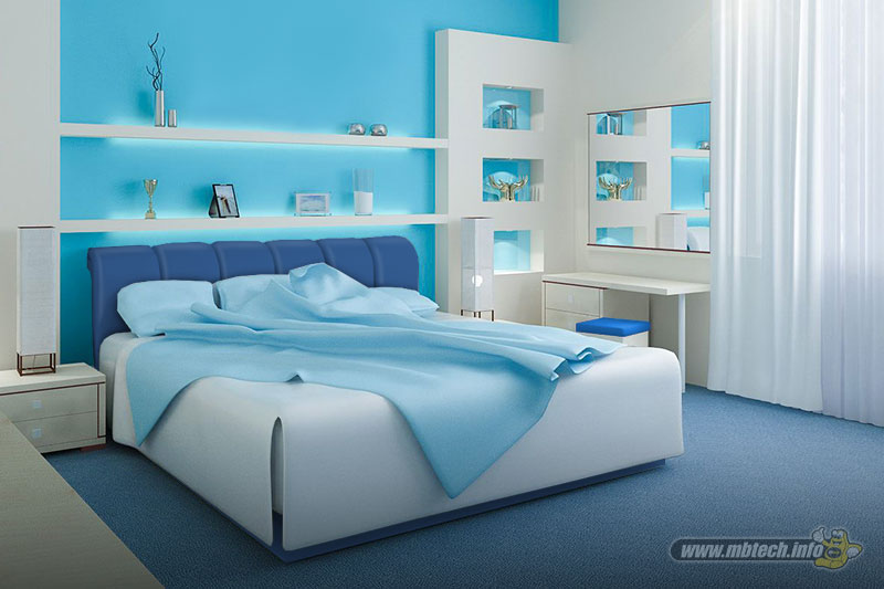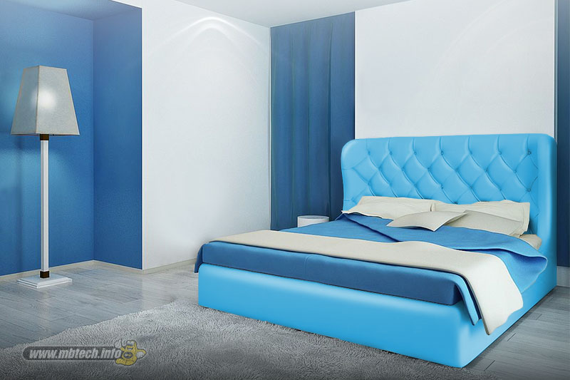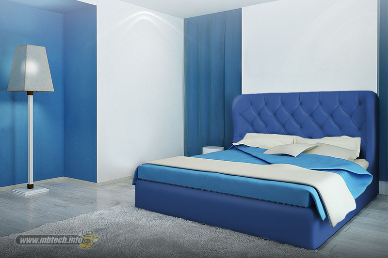 Anda bisa memberikan warna cat pada dinding dengan warna biru muda atau biru yang lebih gelap. Padukan dengan sisi tembok berwarna putih agar tidak monoton. Selain itu, lengkapi dengan furnitur berwarna senada, seperti tempat tidur yang memiliki headboard dan dipan yang dilapisi warna Royal Blue (MB 9020) dari MBtech Camaro.