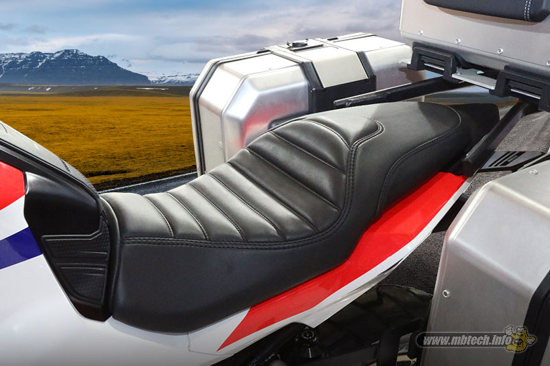 Pamungkasnya sektor jok ikut dipermak agar gaya adventure makin kuat. Model jok custom semi single jadi pilihan. Kontur dudukan rider dibikin bermotif classy dengan jahitan dual stitch, hasilnya desain balok tebal menjadi daya pikatnya.