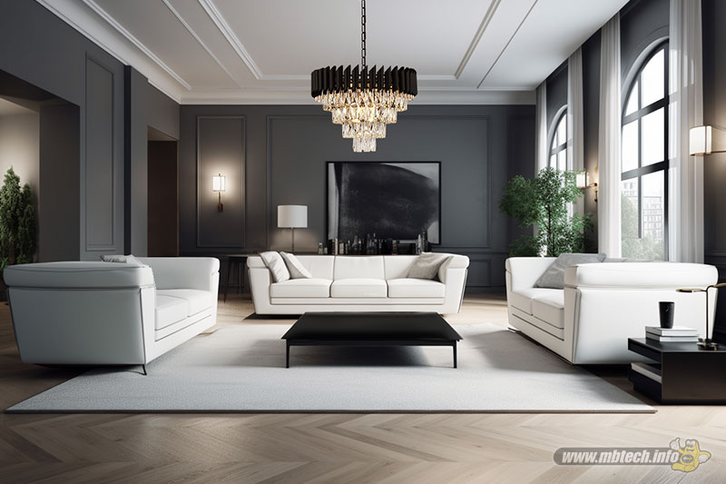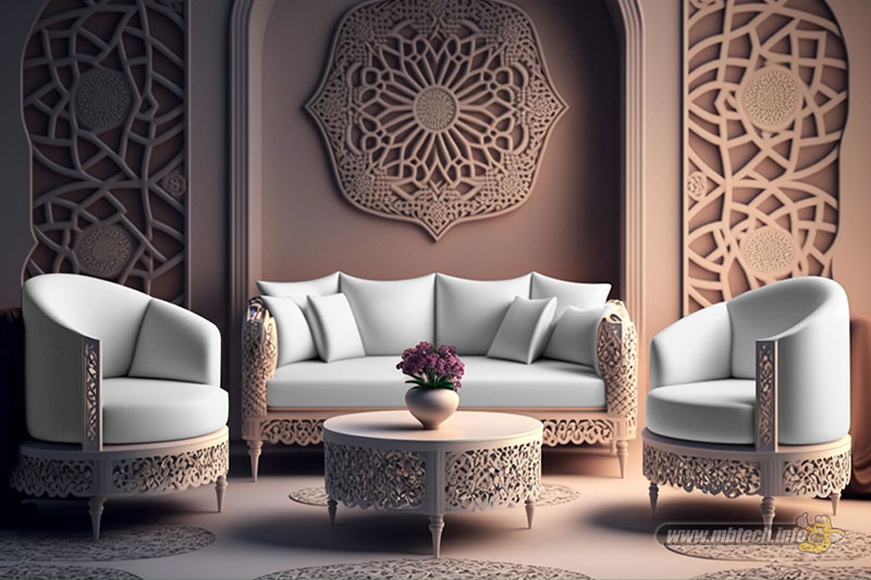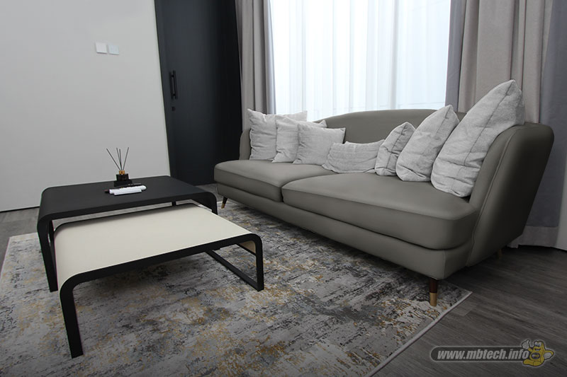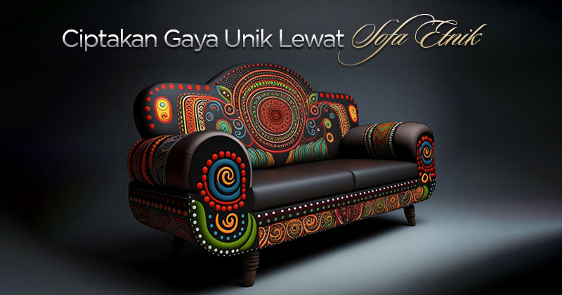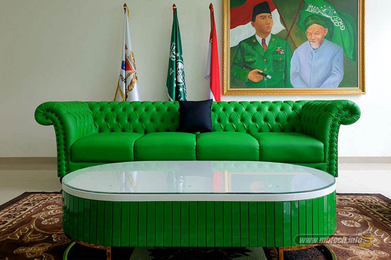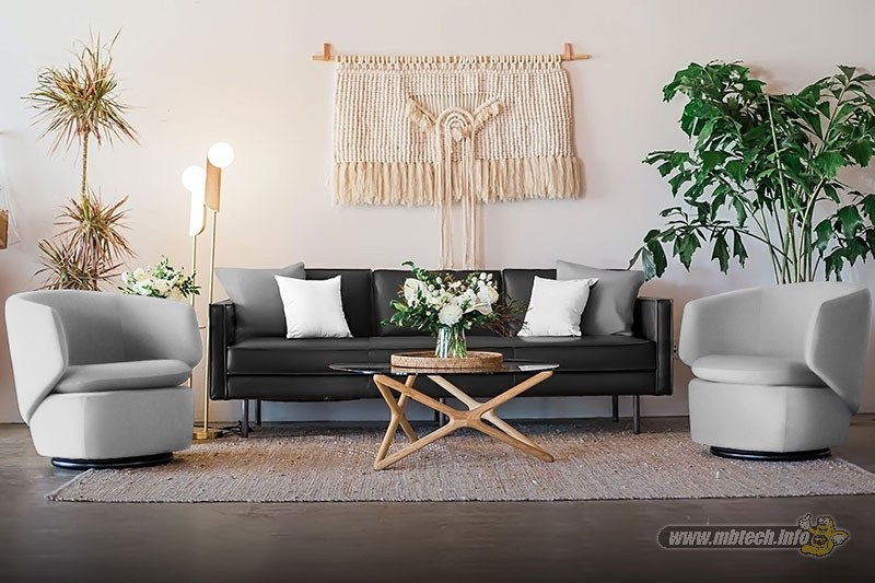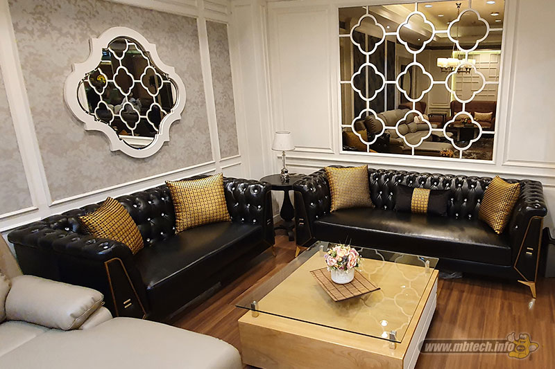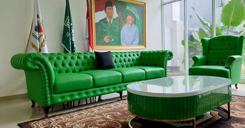 detail sandaran melingkar dan aksen motif hitam glossy, menambah kesan mewah interior ruang tamu.