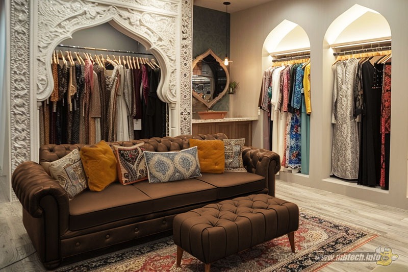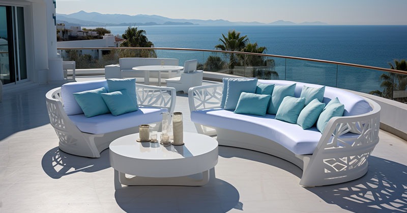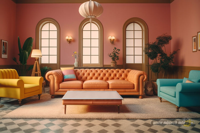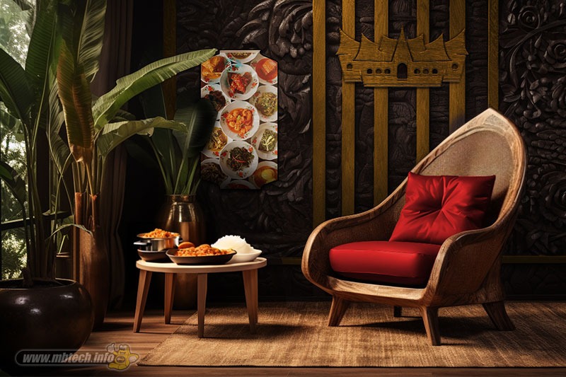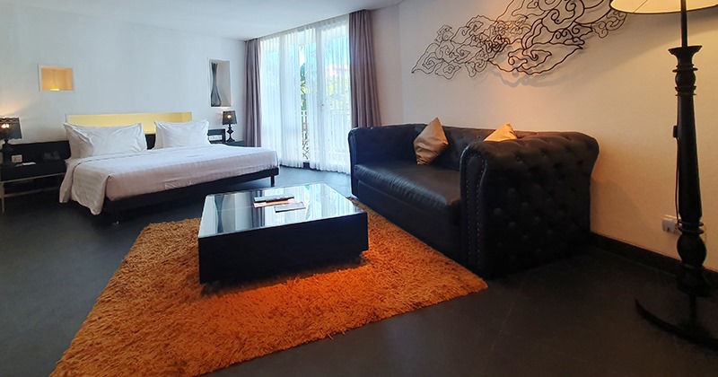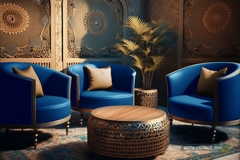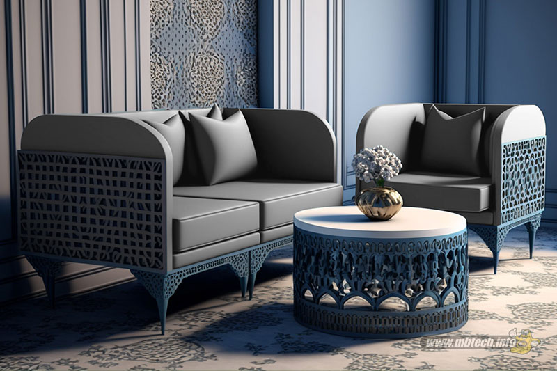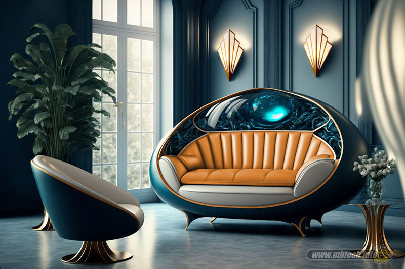 detail sandaran melingkar dan aksen motif hitam glossy, menambah kesan mewah interior ruang tamu.