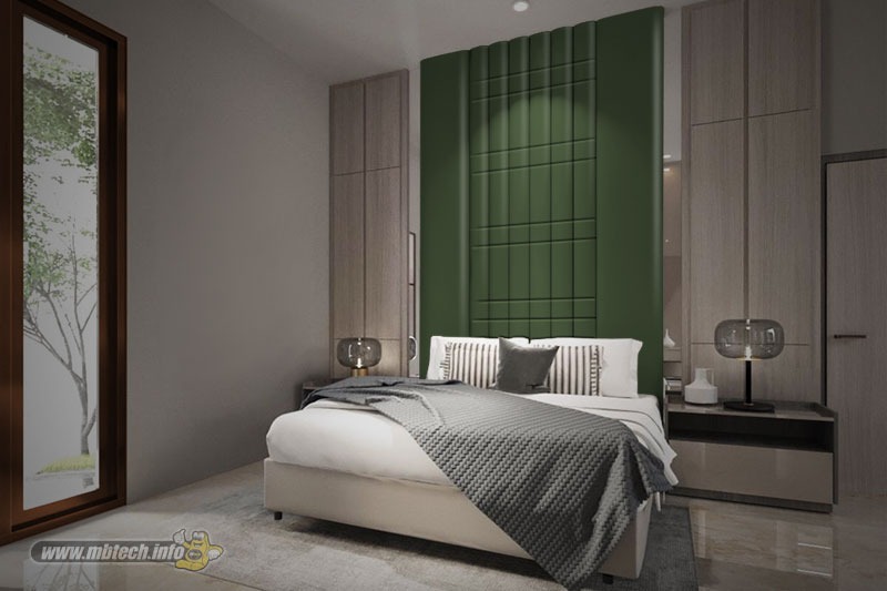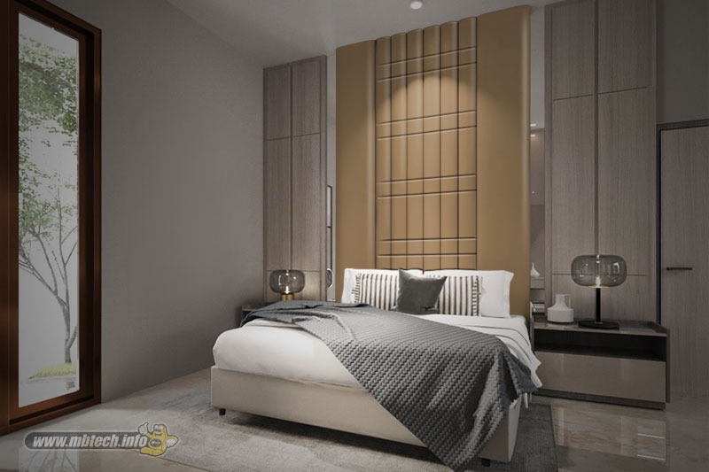 Bukan hanya ruang tamu saja, Anda juga bisa mempercantik tampilan ruang tidur dengan memberikan padded wall sebagai bed headboard. Hadirnya padded wall bisa menjadi elemen dekoratif yang menambah nilai estetis dalam kamar tidur.