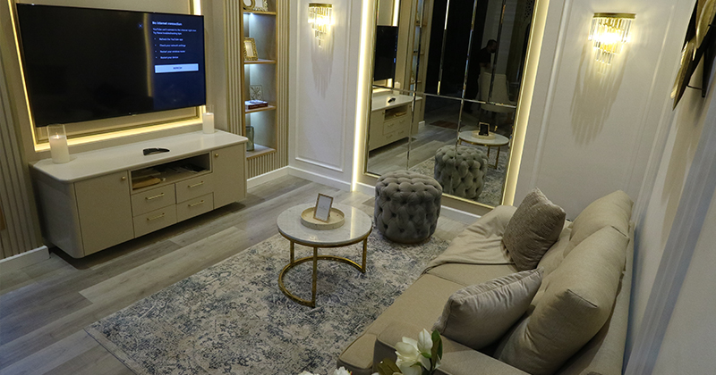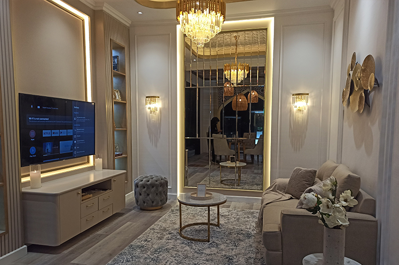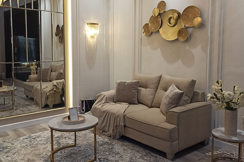Nuansa gold dan warna natural dipadu padan menjadi sebuah tampilan interior ruang keluarga yang memukau. Hadir sebuah cermin estetik besar pada bagian dinding dengan lampu tempel di kedua sisi. Ruangan juga diterangi oleh lampu gantung mewah bernuansa warm.