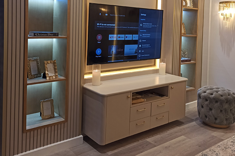 Selanjutnya untuk melengkapi hiburan di ruang tersebut, terdapat TV dengan meja di bagian bawah dan kabinet minimalis di kanan dan kiri. Ruang keluarga tak lengkap dengan hadirnya sofa yang dapat menjadi area berkumpul. Nah untuk pilihan dan warna sofa juga bisa disesuaikan dengan keinginan Anda.