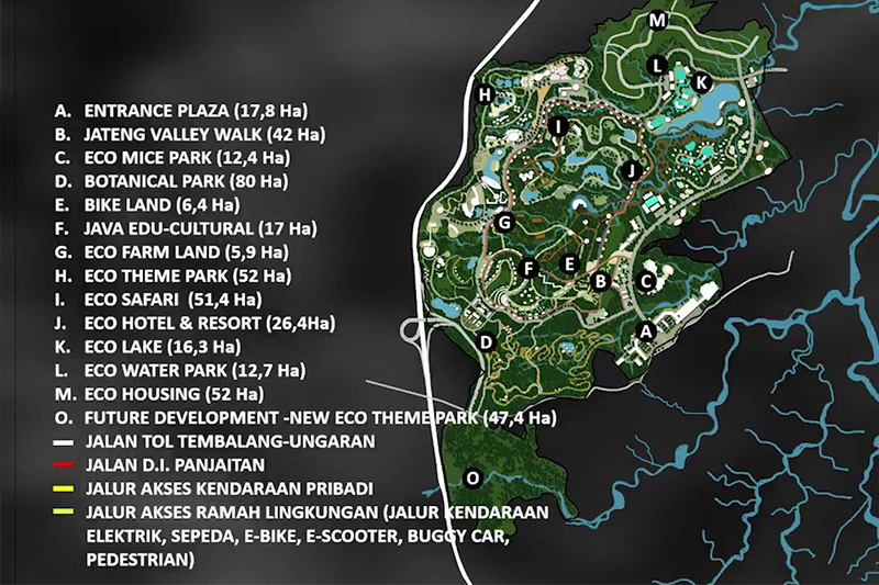 Sebagian besar lahan ini akan dibangun sebagai Botanical Park (80 Ha), Eco Theme Park (52 Ha), Eco Safari (51,4 Ha), Eco Housing (52 Ha), serta berbagai wahana lain seperti Jateng Valley Walk, Eco Farm Land, Eco Water Park, Eco Lake dan masih banyak lagi.
