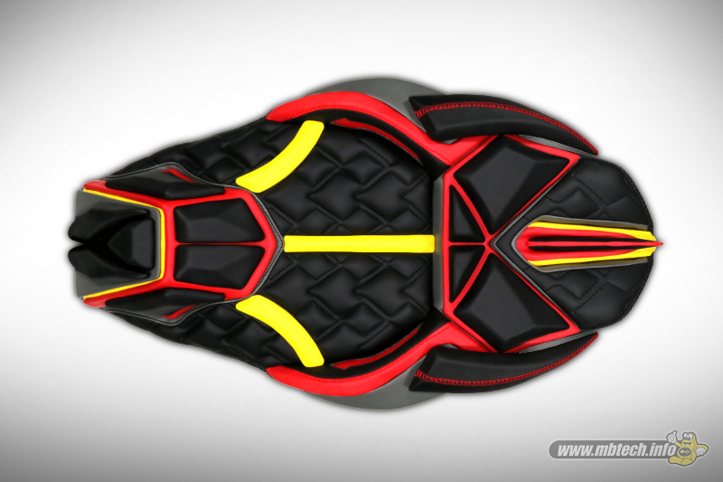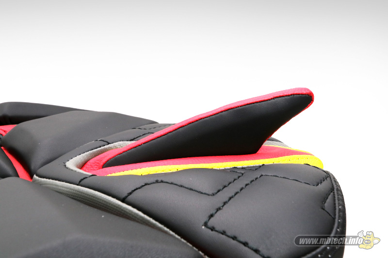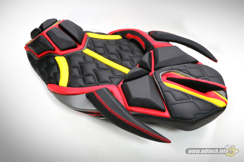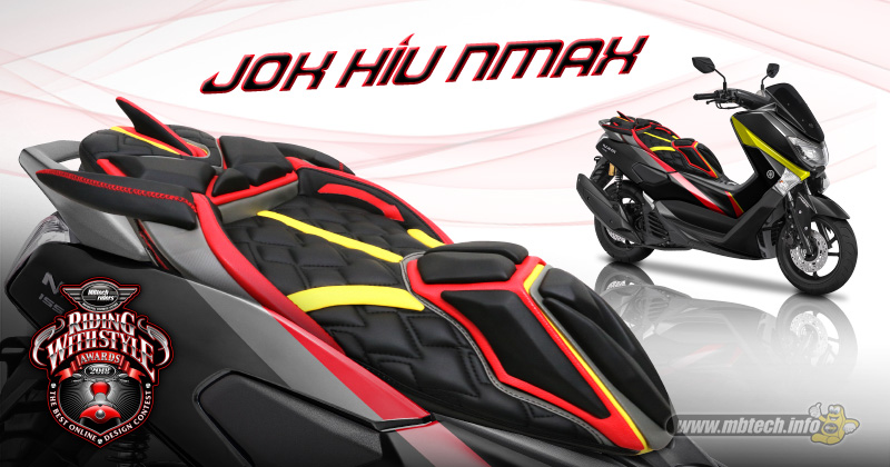 Untuk bahan pelapis jok diambil dari varian MBtech Premium - Carrera , MBtech Riders dan MBtech Camaro Fiesta . Warna jok dominan Hitam atau Black (MBPC 1001) , tetapi agar ‘hiu’ ciptaannya jauh dari kesan menyeramkan, Pa Aes menambahkan aksen warna cerah diciptakan dari pemilihan warna Hip Hop Red (MB 7001) dan Lemon (MB 7005) . Terakhir jok ini juga diberikan sentuhan warna elegan, Grey (MBRC 2302) . Setidaknya warna abu-abu itu mewakili kemewahan dari motor Nmax yang dijadikan basis modifikasinya.
