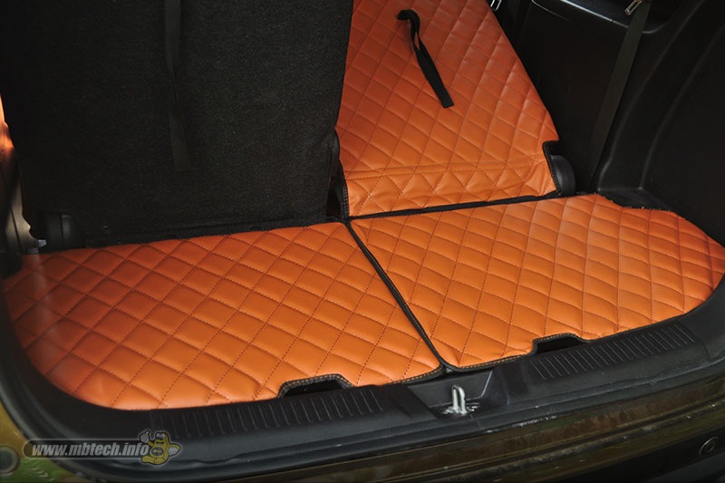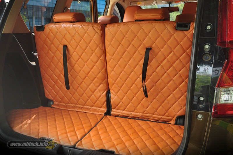 Menariknya pada bagian jok baris ketiga, punggung jok juga dibuatkan motif wajik. Bahkan tempat penyimpanan pada area belakang juga dibalut bahan MBtech. Keren ya.