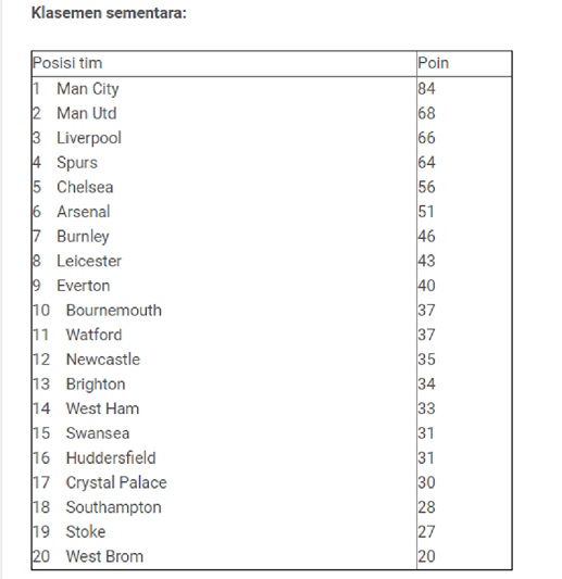 Empat tim posisi teratas dalam klasemen Liga Inggris, Manchester City, Manchester United, Liverpool, dan Tottenham Hotspur meraup tiga poin pada pertandingan pekan ke-32.