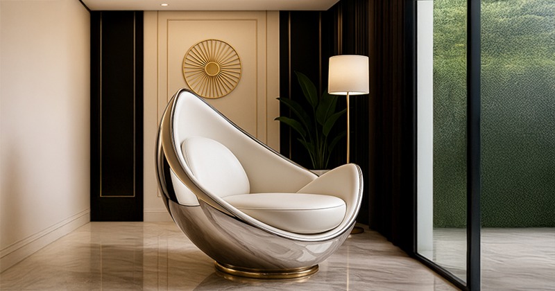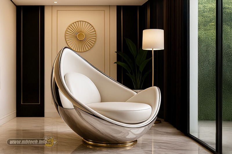 Lanjut ke model kursi model cangkang telur dengan rangka plat besi berlapis krom. Interior kursi dilapis full bahan MBtech Giorgio. Untuk pemilihan warnanya memakai warna abadi yang sejuk, yaitu putih atau Alaska (MB 6006). Makin nyaman busa empuk berlapis MBtech jadi bantalan dudukan/sandaran dari kursi.