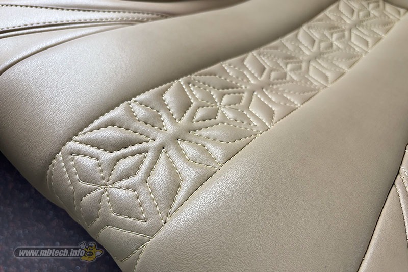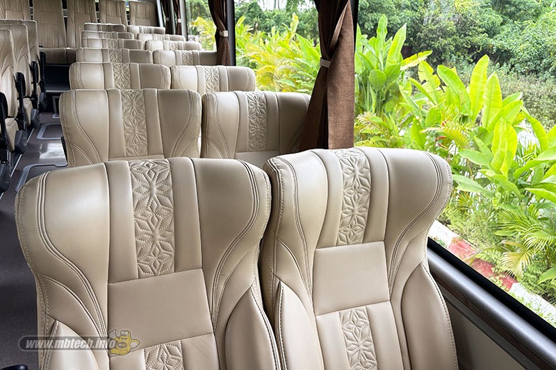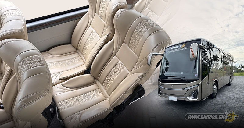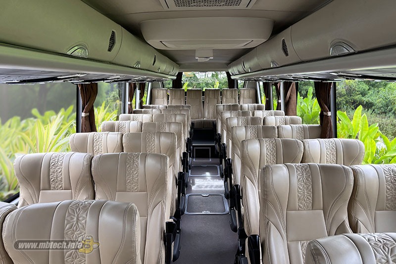Pamungkasnya, semua jok bus berjenis big bus ini dilapis menggunakan bahan MBtech Premium-Carrera Beige (MBPC 1006). Aksen cerah di pelapis selain membuat suasana kabin jadi terlihat makin berkelas, juga membuat interior terasa lapang.