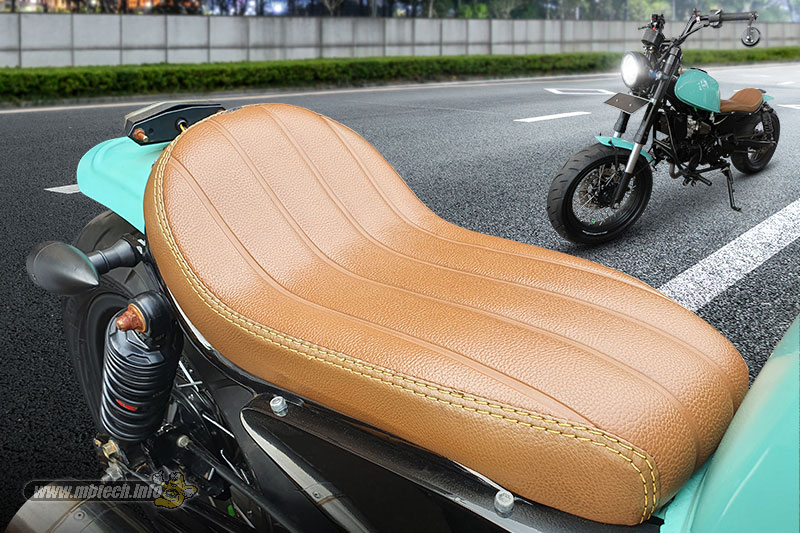 Tampilannya kece banget. Mulai dari warna tangki yang dicat warna tosca dengan tampilan wet look, hingga jok berwarna coklat dengan motif garis yang klasik.