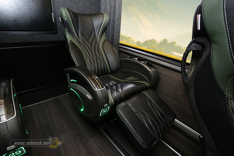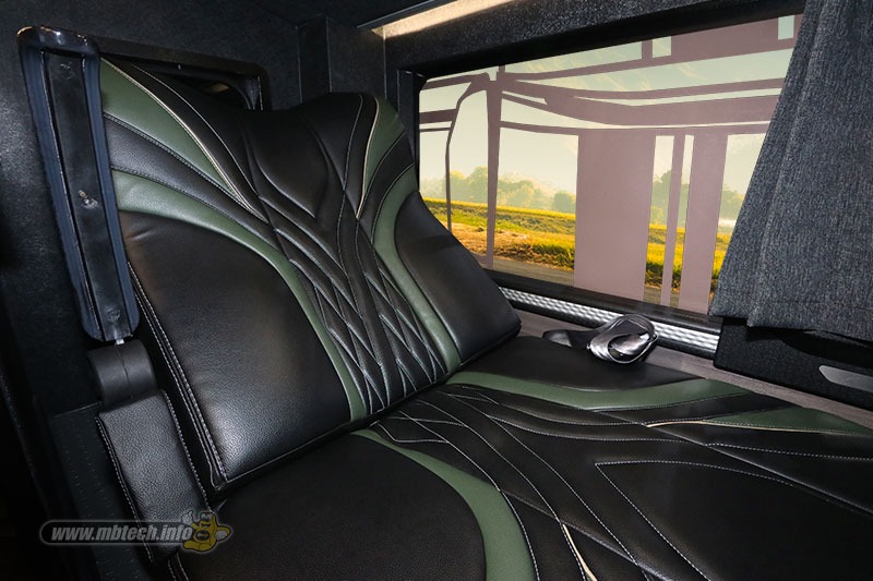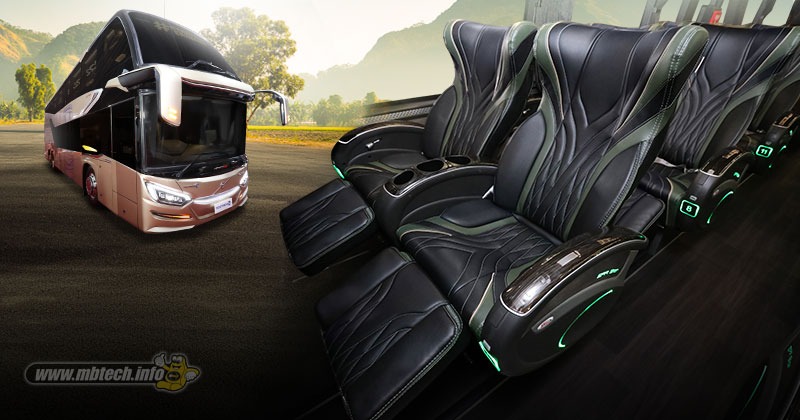 Lalu biar makin nyaman diperjalanan semua jok bus, baik yang di area Executive dan Sleeper Cabin menggunakan pelapis MBtech Camaro. Koleksi warna elegan yang tampil serasi dengan ambience kabin, pihak Tentem memilih warna Black (MB 9001) dan Army Green (MB 9019).