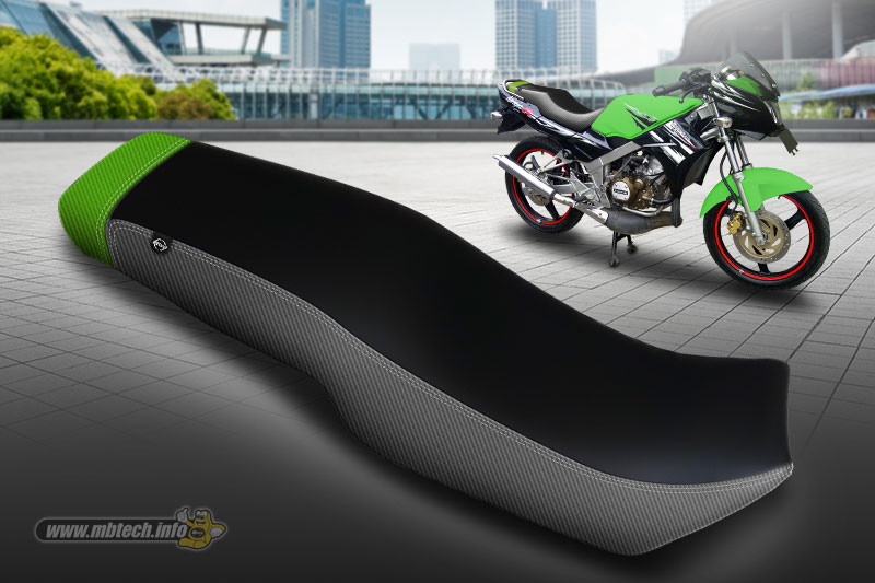 Lanjut ke desain berikutnya, Mister MB membuat permukaan atas jok tetap warna Black. Sedangkan di sisi samping jok didominasi oleh warna Grey bertekstur serat karbon. Agar terlihat lebih personal, Mister MB menambahkan grafis menarik di sisi jok bagian depan. Yakni dengan menyematkan warna Red atau Green yang ditambahkan grafis ‘Ninja R’ dengan teknik bordir.