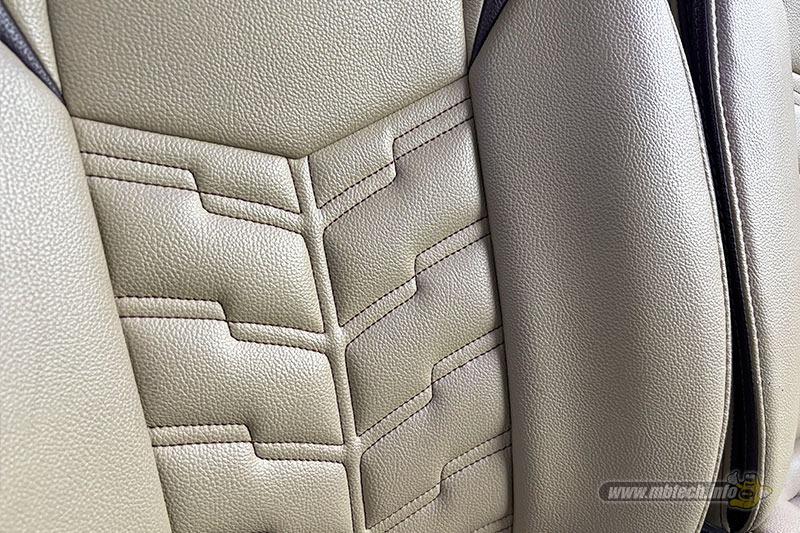 Seat manufacturer asal Malang, Jawa Timur ini merancang jok jumbo double seat ini dengan busa tebal yang nyaman, bahkan di area sandaran kepala (headrest) ditambahkan extra cushion. Untuk motif area dudukan/sandaran memakai jahitan cnc berpola metal strap ala arloji mewah.