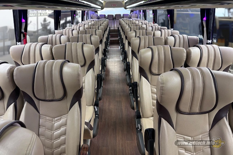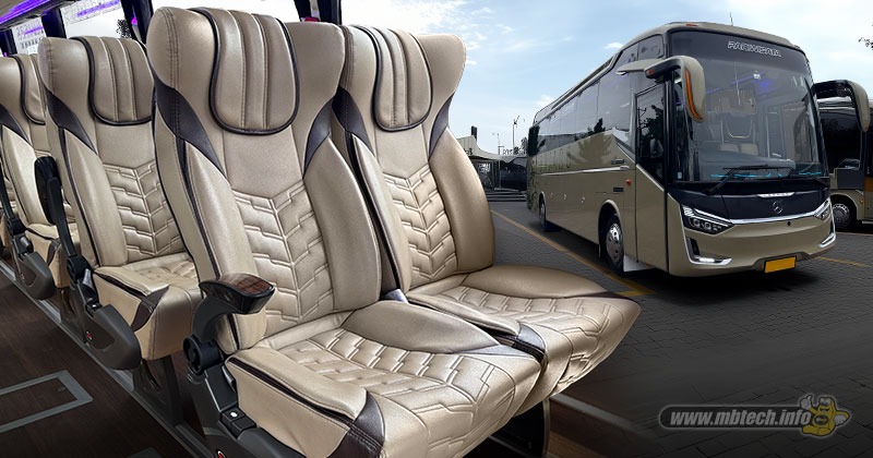 Pamungkasnya pelapis jok bus pariwisata mewah ini memakai pelapis MBtech Camaro warna Beige (MB 9009) sebagai warna utama. Lalu aura luxury makin terpancar lewat kombinasi lis pada sayap jok dan cushion tambahan di headrest dengan warna Dark Brown (MB 9013).