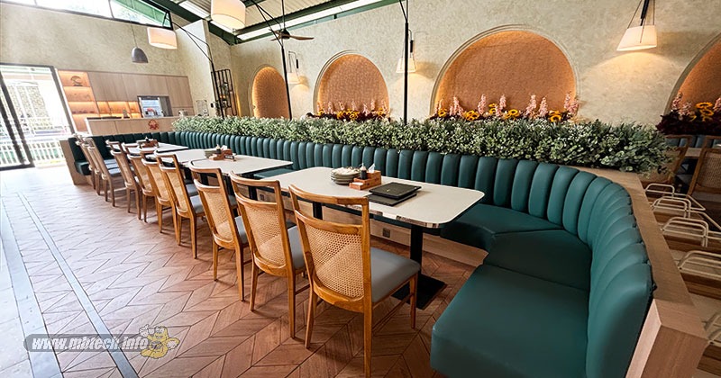 Tampak dudukan kursi makan kayu berpelitur itu dilapisi MBtech Giorgio, warna yang dipilih adalah Fossil (MB 6004). Lalu ada sofa model U yang diwarnai cushionnya memakai Tosca (MB 6040) serta cushion sofa panjang yang menempel di dinding resto dilapis bahan berwarna Aurora (MB 6039).