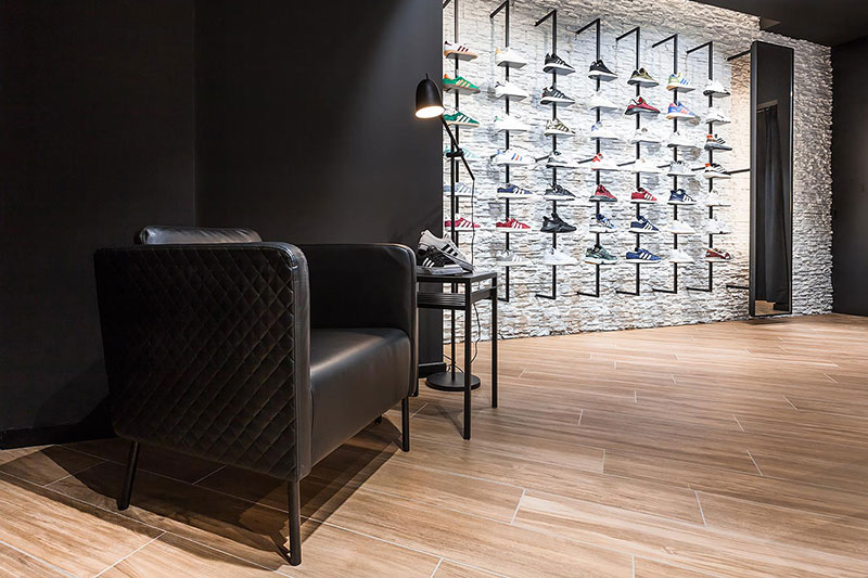 Tak kalah keren, Stratosphere yang interiornya bernuansa monokrom ini juga bisa menjadi referensi bagi pemilik shoe store yang sedang merancang ulang interiornya.