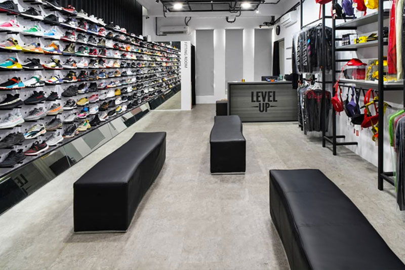 Di beberapa mall Jakarta juga ada shoe store yang punya tampilan interior estetik. Seperti Level Up yang interiornya bernuansa monokrom. Tak lupa di tengah ruangan diberikan sofa bench panjang untuk konsumen mencoba sepatu di toko tersebut.