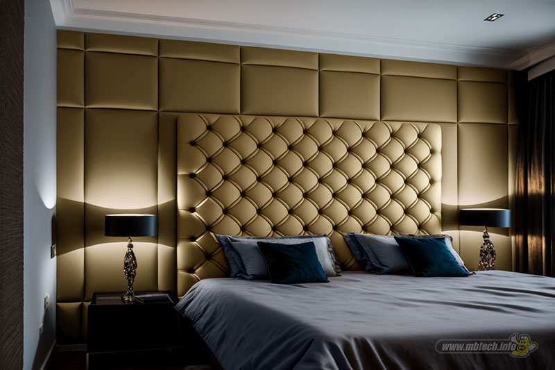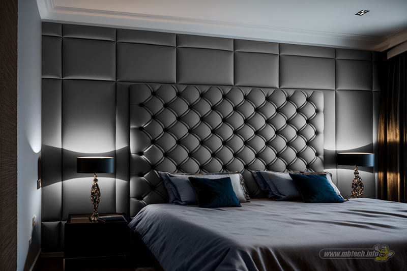 Area kamar menjadi inspirasi selanjutnya. Hadirkan padded wall secara penuh pada bagian dinding yang bagian kepala kasur. Makin menawan jika headboard juga dibuat lebih besar dengan motif yang berbeda dari padded wall. Mainkan satu warna yang sama untuk padded wall dan headboard. Seperti menggunakan warna Grey (MBPC 1003) atau Beige (MBPC 1006) dari MBtech Premium – Carrera.