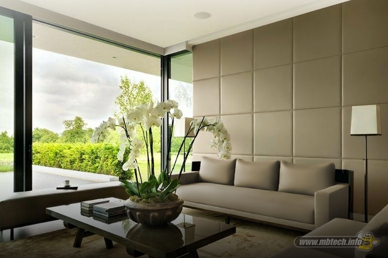Menarik juga jika ruang kamar atau ruang keluarga yang bernuansa natural menggunakan padded wall dengan warna senada dengan furnitur. Seperti kamar ini yang menggunakan padded wall dengan pola kotak-kotak dengan balutan bahan MBtech Premium – Carrera warna Iguana (MBPC 1009). Atau ruang keluarga yang menggunakan padded wall dengan warna Beige (MBPC 1006). Terlihat menarik kan.
