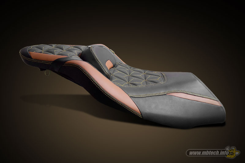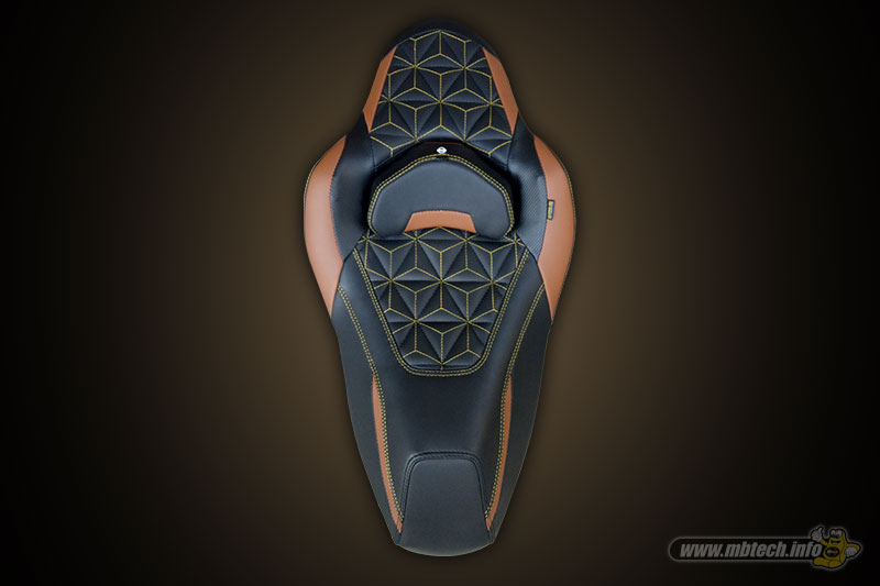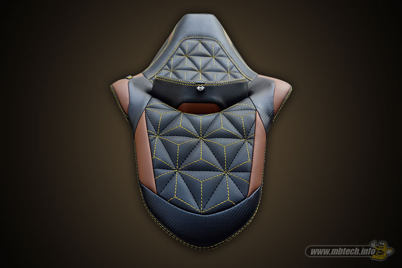 Ahmad Mufri alias Gephenk dengan cantik memasukkan desain 3D triangle ke dalam jok custom yang memakai kulit sintetis MBtech Premium-Carrera itu. Serunya motif 3D itu menjadi aksen di dudukan jok dan tidak lupa motif itu dibuat dari benang berwarna emas.